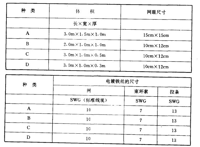 多数水力结构的防洪堤及下游渐变部分将部分地或全部地依照图纸所示或工程师的指示用石笼垫加以防护,根据尺寸的不同下表列出4种石笼垫。